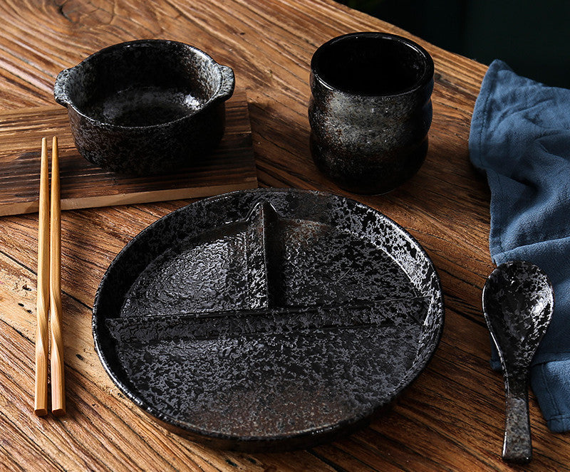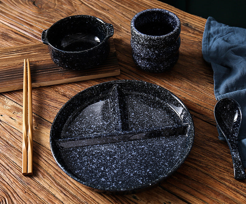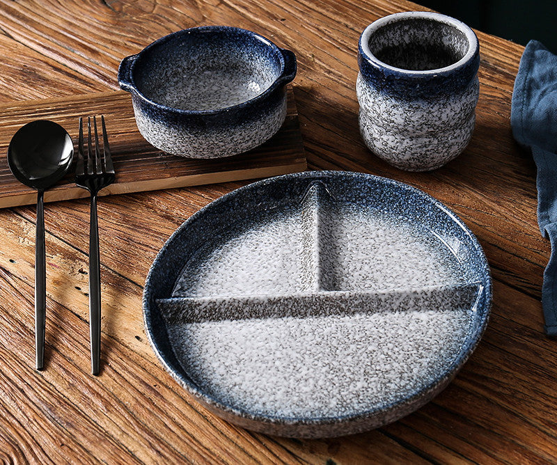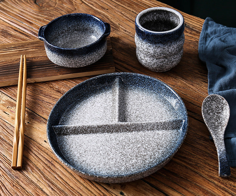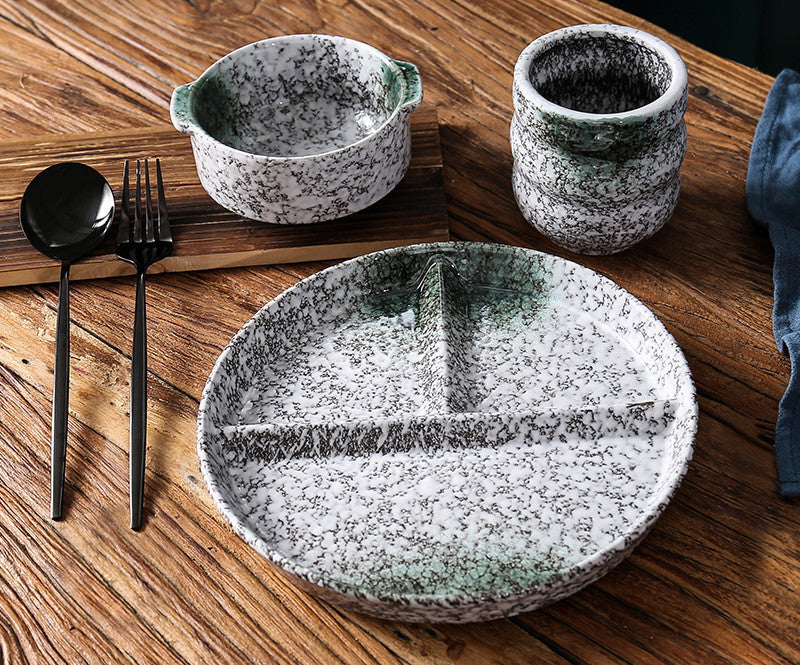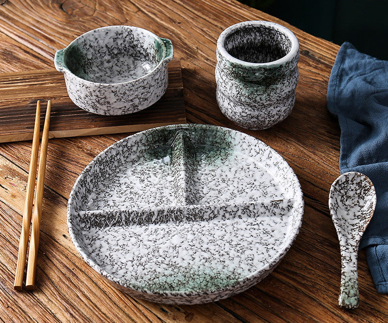 Product Details: Pattern: plain Shape: round Material: Porcelain Popular elements: retro Color classification: Size: Grid plate height 2.8cm length 21.4cm / rice bowl length 12.3cm height 5.4cm / tea cup length 8cm height 9.2cm height spoon 13.7cm length