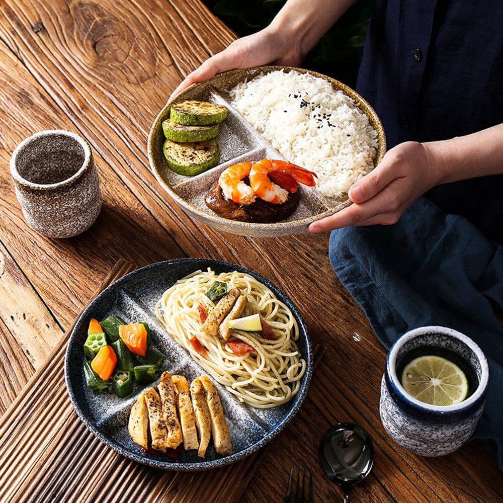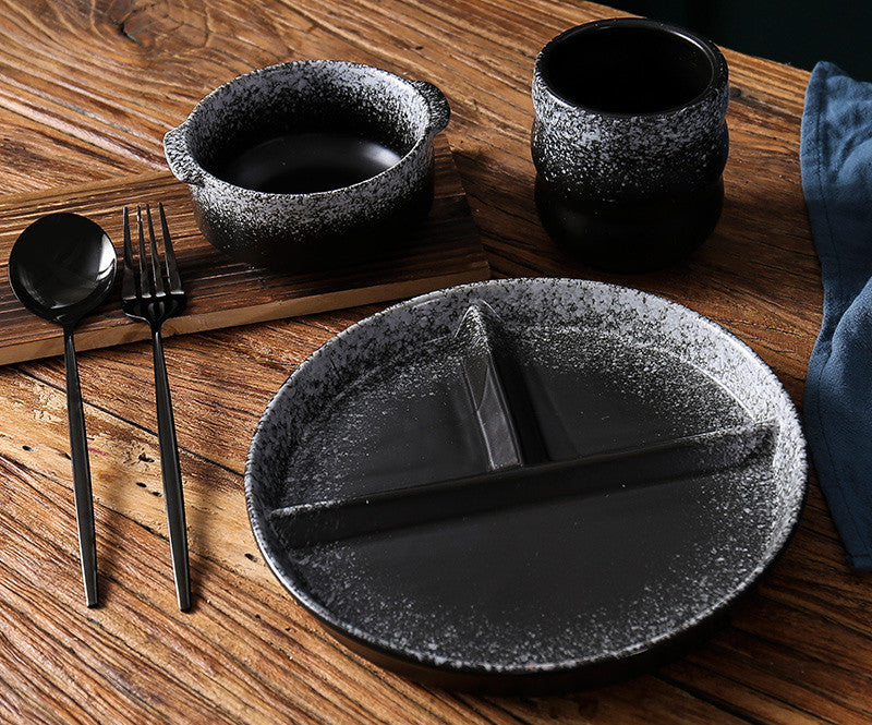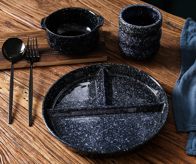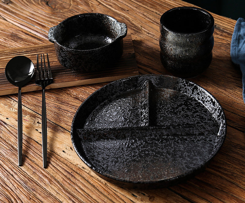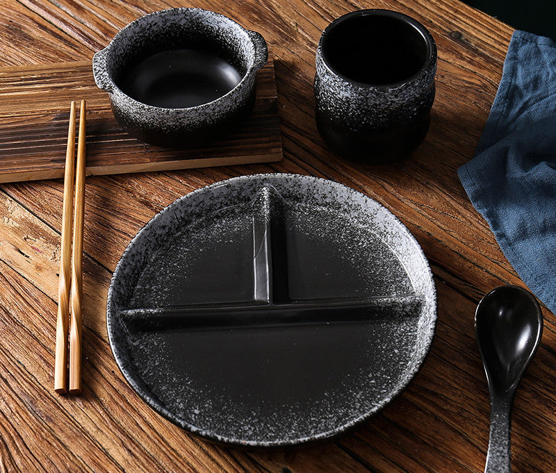 Product Details: Pattern: plain Shape: round Material: Porcelain Popular elements: retro Color classification: Size: Grid plate height 2.8cm length 21.4cm / rice bowl length 12.3cm height 5.4cm / tea cup length 8cm height 9.2cm height spoon 13.7cm length